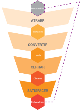 La metodología del Inbound Marketing se basa en atraer tráfico a los canales online. Convertir las visitas en leads gracias a contenidos personalizados. Y finalmente convertir los leads en clientes y satisfacer a esos clientes para que nos recomienden.