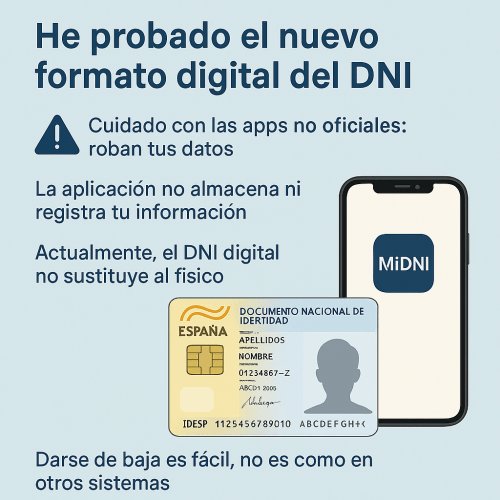 La semana pasada me di de alta en el nuevo formato digital del DNI a través de la app oficial MiDNI. Cuidadín que ya corren por ahí muchas apps no autorizadas que imitan a la oficial, que te roben estos datos del DNI es un gran problema ya que es una información muy valiosa y sensible. Según el Ministerio del Interior, esta aplicación no almacena tus datos personales, ni registrar cuándo o dónde la utilizas. Además, la app cuenta con múltiples capas de seguridad. De hecho, el proceso de alta no es precisamente sencillo. En mi caso, necesité tres intentos hasta que logré completarlo con éxito.